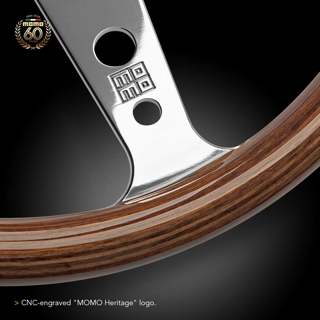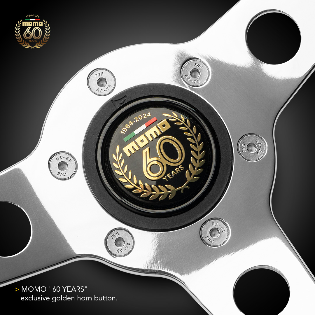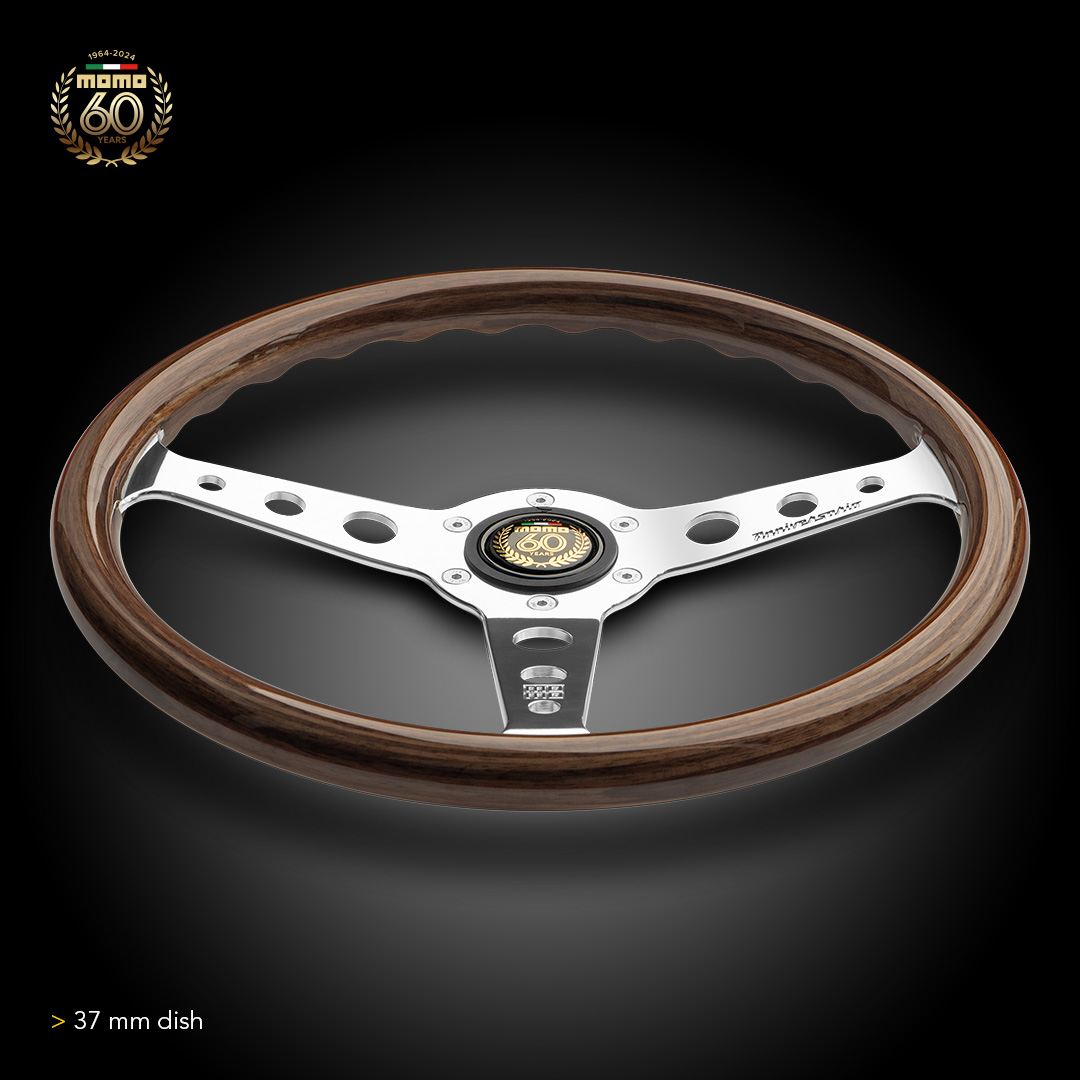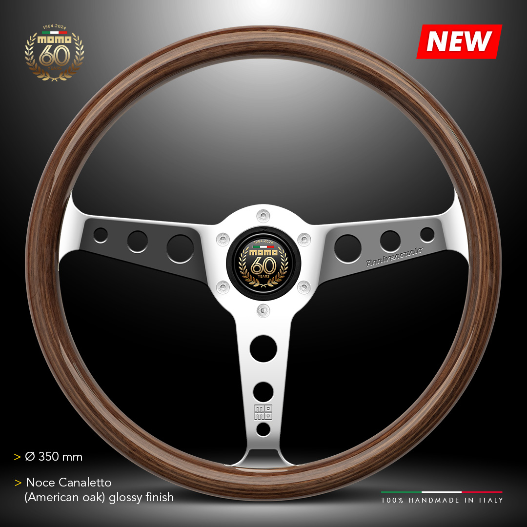 Durchmesser: 350 mm Schale: 37 mm. Griffstück: 27 x 26 mm. Fingerrillen auf der Rückseite. Griffmaterial: Noce Canaletto (Amerikanische Eiche), glänzende Oberfläche. CNC-graviertes „Anniversario“ und MOMO Heritage-Logo. MOMO „60 JAHRE“ goldener Hornknopf. MOMO-Box zum 60-jährigen Jubiläum.